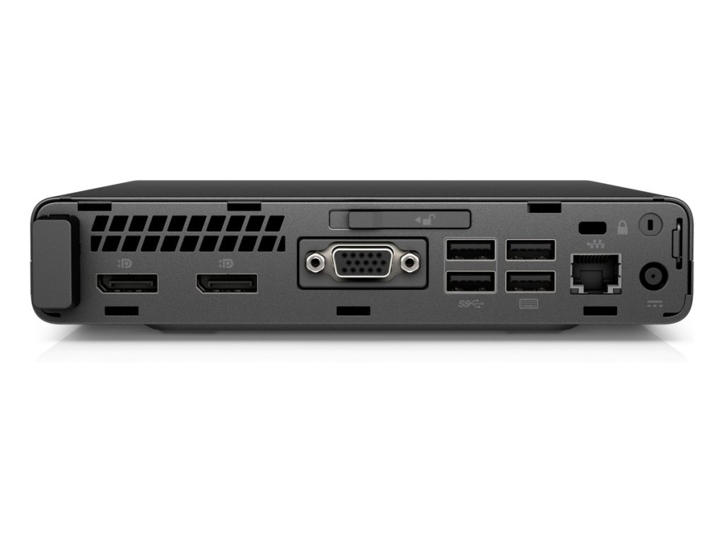 Minimalistický vzhľad sa samozrejme oproti väčším modelom premietol do konektorovej výbavy, ktorá je ale dostatočná. Predný panel je vďaka malej hrúbke rozdelený v podstate napoly. Hornú časť tvorí čierne rebrovanie av dolnej striebornej ploche je umiestnené zapínacie tlačidlo, port pre slúchadlá a mikrofón, dva porty USB 3.1 a jeden port USB-C. HP EliteDesk 800 G3 Mini má čo ponúknuť aj v zadnej časti. Sú to štyri porty USB 3.1, RJ-45, dvakrát DisplayPort a VGA, poprípade HDMI.